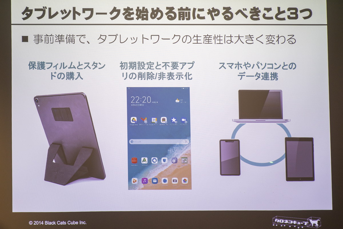今後の導入が見込まれるタブレットですが、導入前にやっておくことが3つあるといいます。それは、保護フィルムとスタンドの導入、初期設定と不要アプリの削除(非表示化)およびスマホやパソコンとのデータ連携だそう。