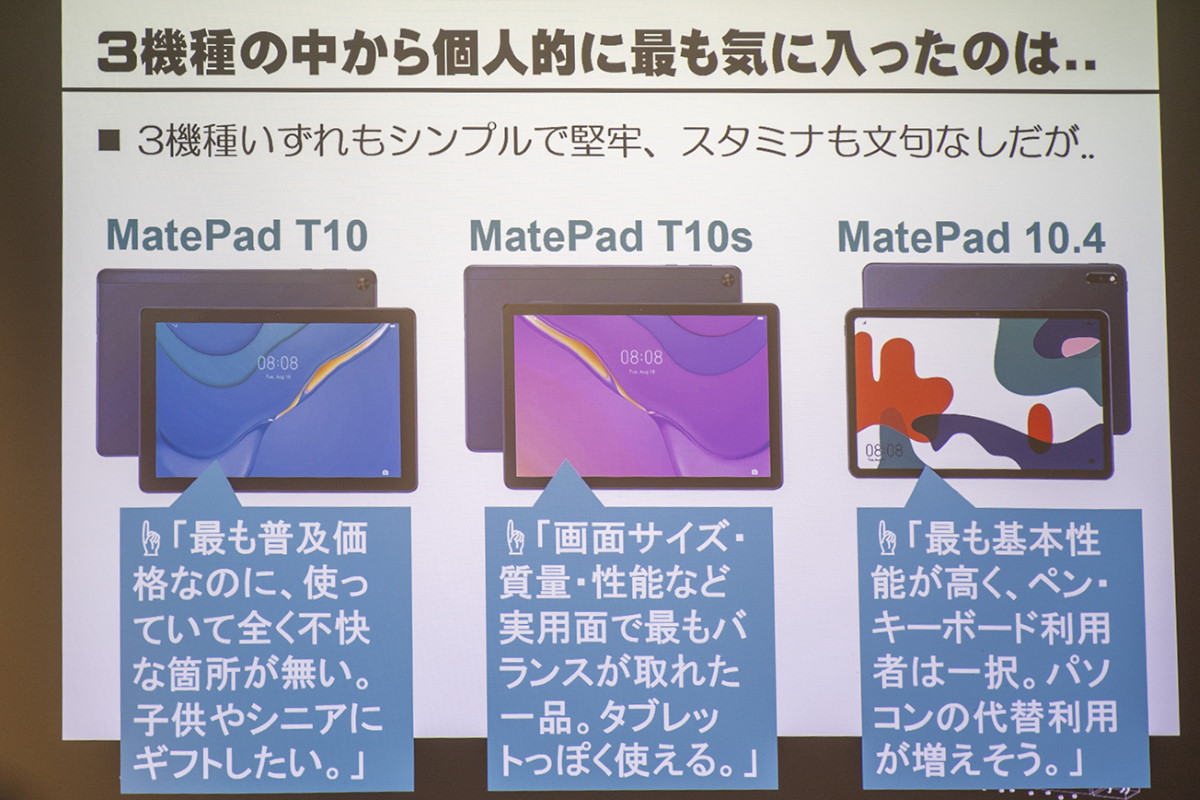 岡田氏が今回テストしたファーウェイ製のタブレットで気に入ったのは「HUAWEI MatePad T10s」で、自腹購入もしたほど。画面サイズ、質量、性能などのバランスが取れていることが決め手だったといいます。