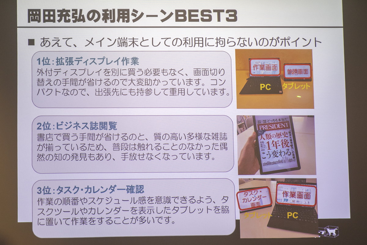 岡田氏は、この講演に際して実際に数週間ファーウェイのタブレットで仕事を行い、どのような業務に適しているかなどを検証したとのことです。