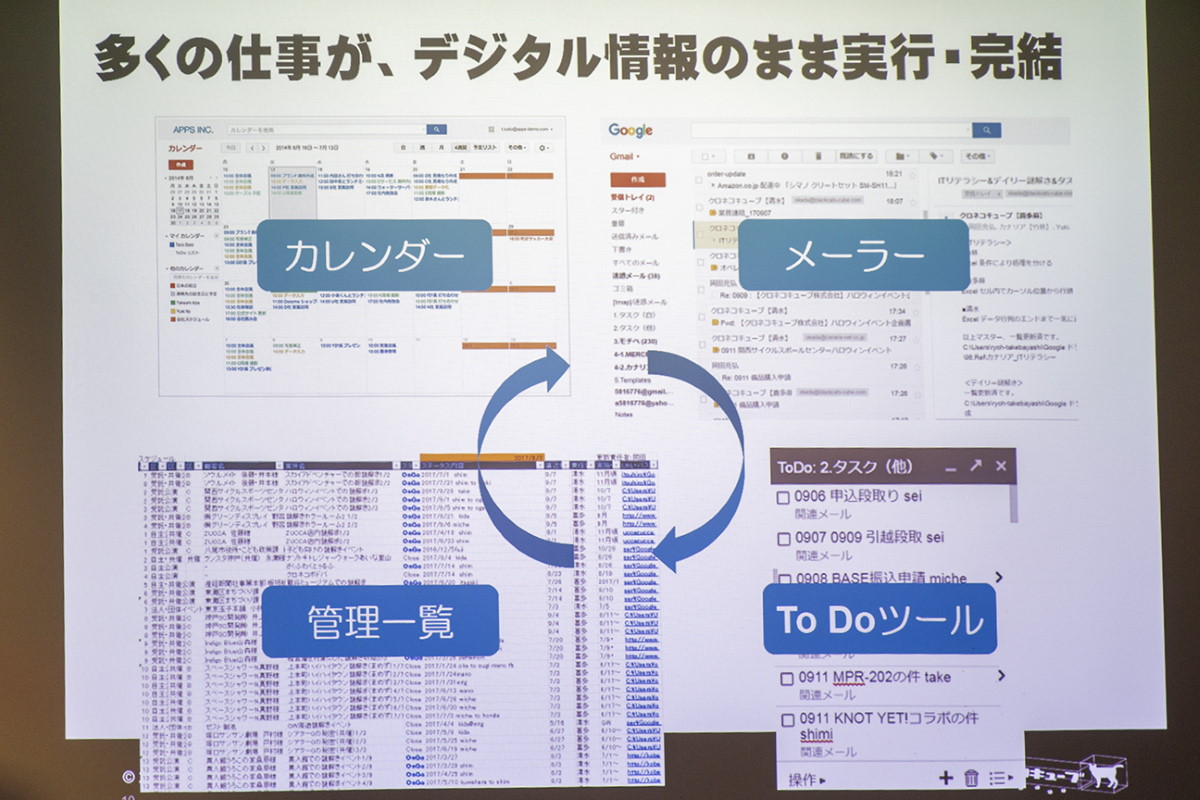 講演には「超速パソコン仕事術」「仕事のムダとり図鑑」などの著者で、クロネコキューブ株式会社 代表取締役の岡田充弘氏が登壇。働く環境が変わりつつあるなかで、デバイスにこだわらずに適所で使い分けながら効率的に仕事を進めてゆくワークスタイルの提案などが行われました。