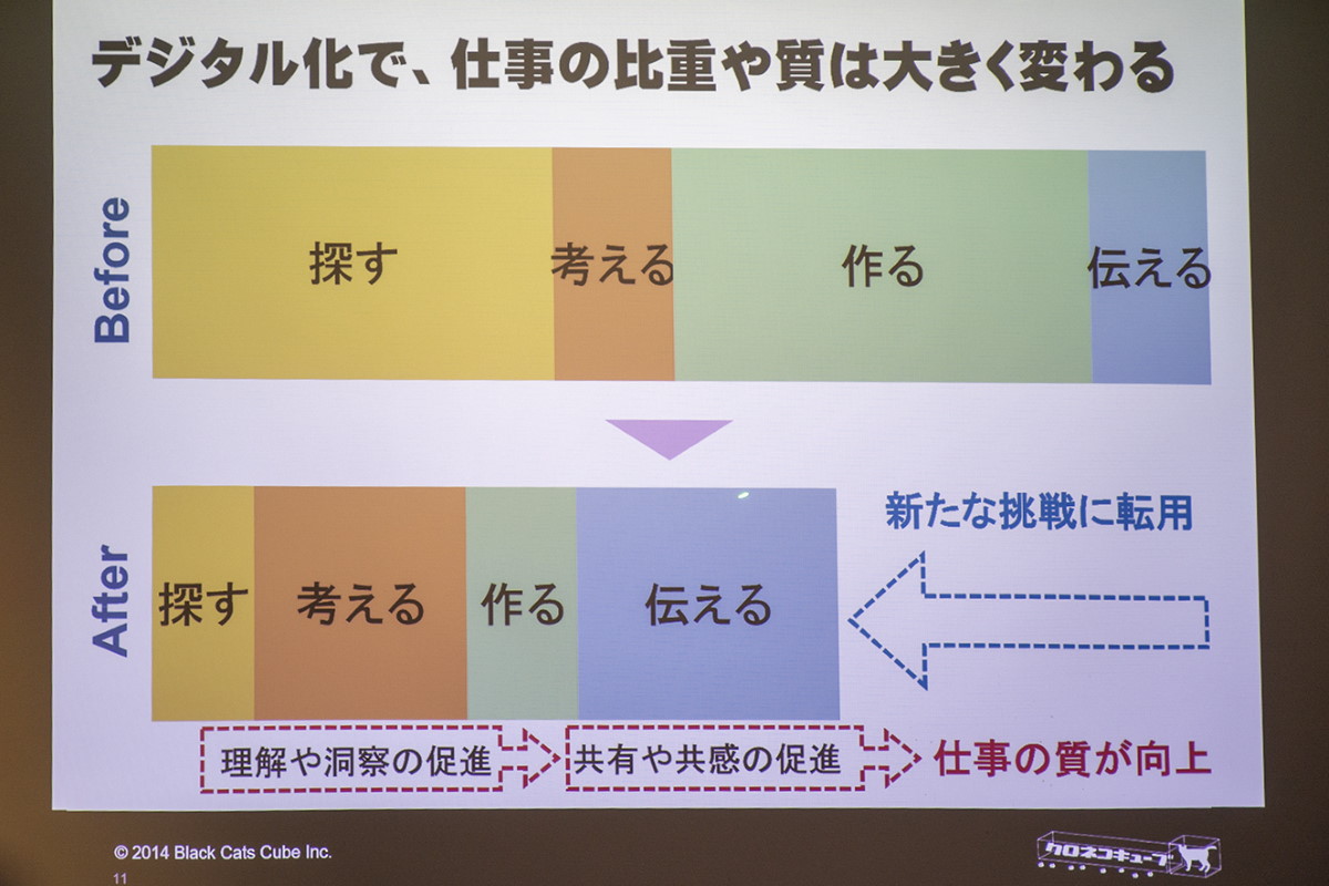 デジタル化の恩恵を主に受ける頭脳労働は、「探す」「考える」「作る」「伝える」という4つのプロセスで構成されており、デジタル化によって「探す」「作る」時間を短縮することができるとしています。それによって空いた時間を「考える」と「伝える」ことにあてたり、新たな挑戦に使うことで、仕事の質も向上するという考えが示されました。
