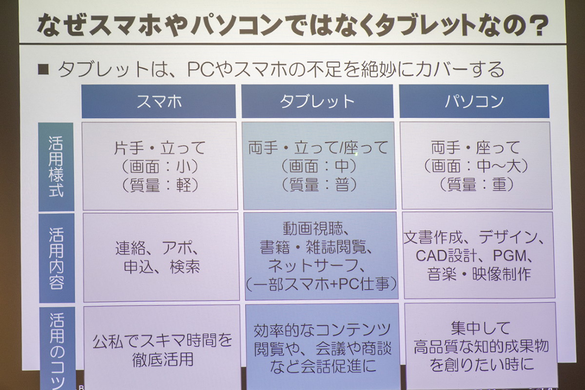 スマホやタブレット、パソコンを比較した時、それぞれのデバイスで使い方や活用に独自コツや適した使い方があります。タブレットは、スマホとパソコンだけでは不足する領域を絶妙にカバーするとのこと。動画や資料の再生、閲覧はスマホより大画面の方が見やすいですし、会議や商談の際にはキーボードのあるパソコンよりも心理的障壁のないタブレットの方が会話の促進が見込めるとしています。