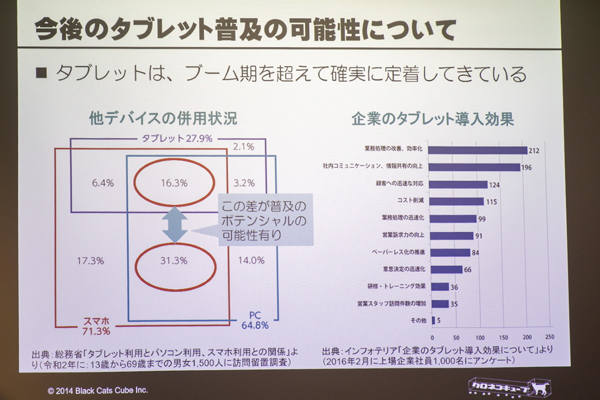 仕事においても、いままでは職場の全員にパソコンを配布されていましたが、全員がイチから資料を作ったりする必要はなく、作られた資料をもとに説明したりテンプレートに数値を入力するという業務だけの人も多く存在します。そのような潜在ユーザーが今後タブレットに置き換わってゆくのではないかという可能性が示されました。