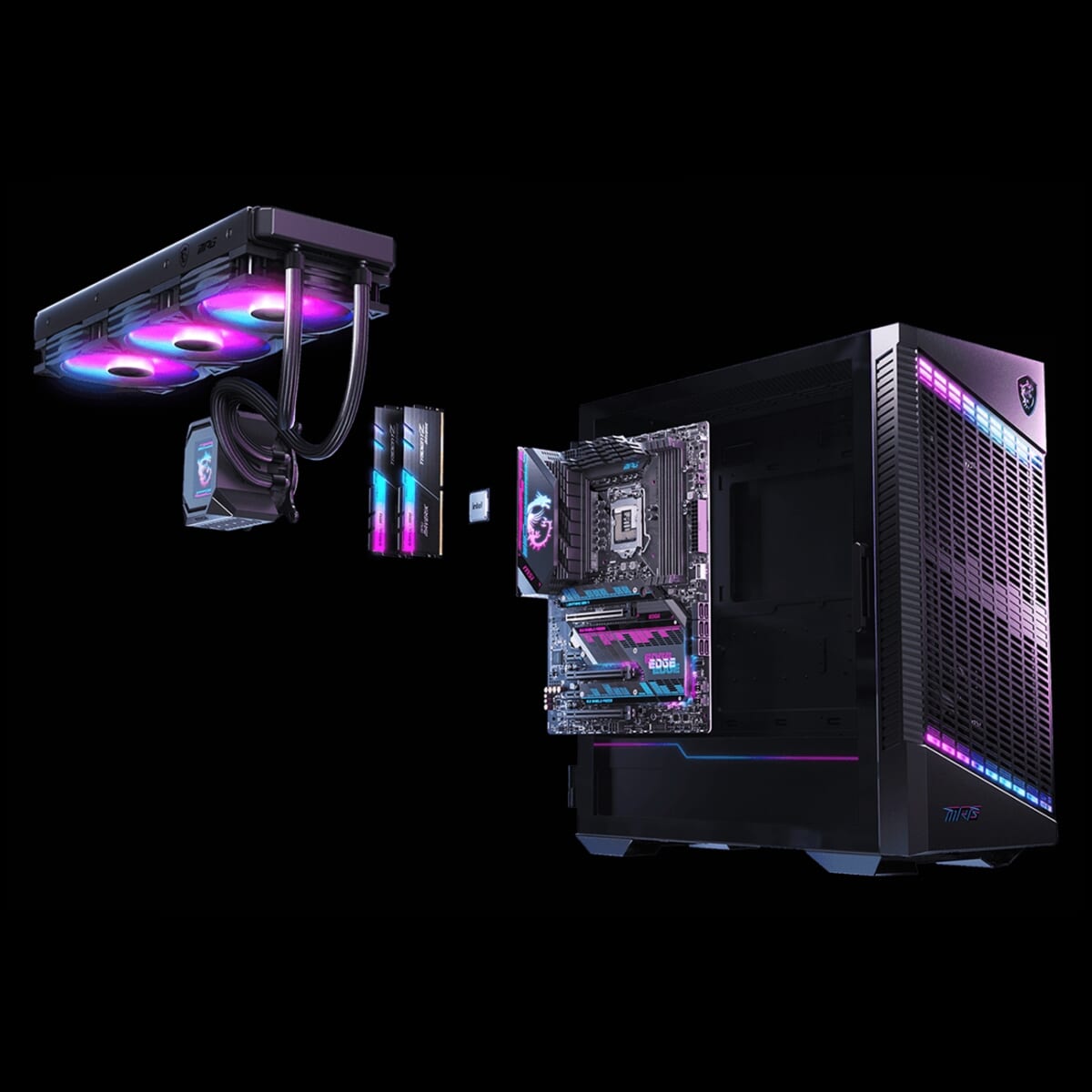 同梱されるパーツはハイエンドなチョイスが目立ち、いずれもこのキット用にカスタムされているのが特徴。CPUはインテル製の上位モデル「Core i7-11700K」で、メモリーは動作クロックを意図的に上げるオーバークロックに定評のあるG.SKILL「Trident Z Maverik DDR4-3600」をバンドル。マザーボード「MPG Z590 GAMING EDGE WIFI SP」、PCケース「MPG VELOX 100P AIRFLOW SP」、「MPG CORELIQUID K360 SP」はいずれもMSI製で、全体の配色、LEDによるライティング効果などが調整されており、組み上げた際に統一感のある外観になるよう配慮されています。