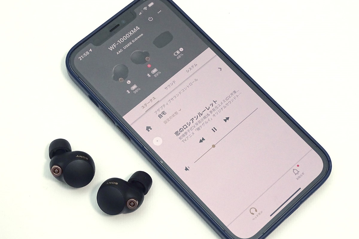 アップルのAirPods Proは外音取り込みモード時の音の聴こえ方がとてもクリアなイヤホンです。ソニーの1000XM4は専用アプリ「Sony Headphones Connect」を使って、外音取り込みの強弱をマニュアルで細かく調節できる機能が特徴。イヤホンを装着しているユーザーの行動をアプリが検出して、ノイキャンと外音取り込みのバランスを自動調節する「アダプティブサウンドコントロール」機能も搭載しています。