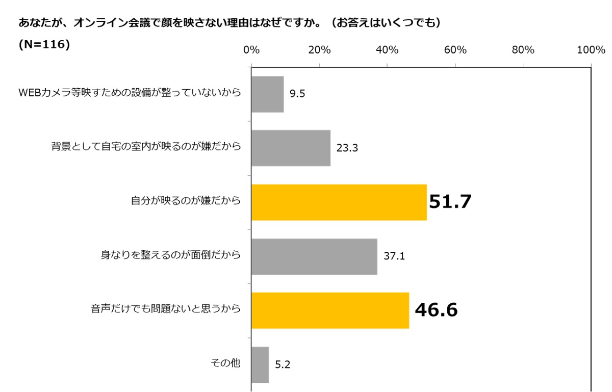 「オンライン会議で自分の顔を通常映さない」と回答した人にその理由を聞くと、「自分が映るのが嫌だから」という回答が51.7%、また次に多い「音声だけでも問題ないと思うから」という回答が46.6%となりました。