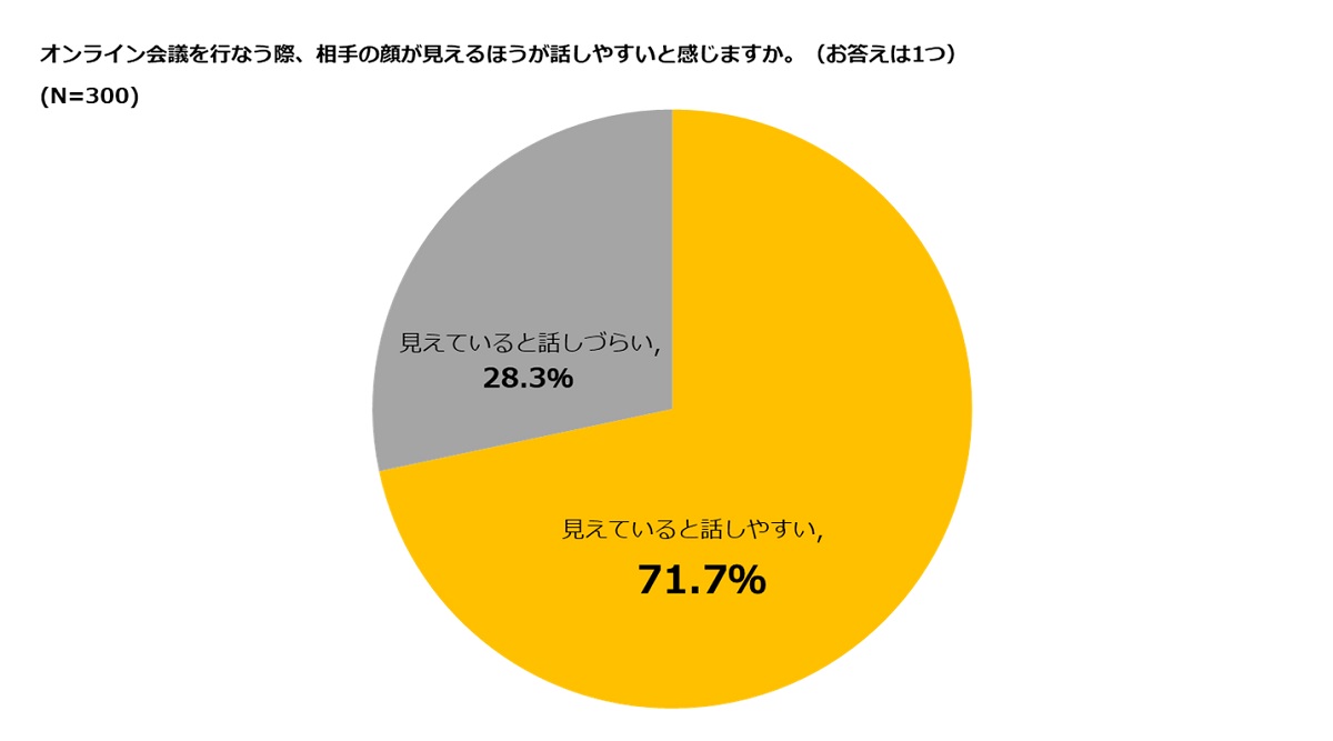 オンライン会議で顔を表示することについての質問では、「相手の顔が見えてる方が話しやすい」と答えた人は全体の7割以上を占め、 オンライン上でも相手の顔を見たほうが話しやすいと感じている人が多いことが分かりました。