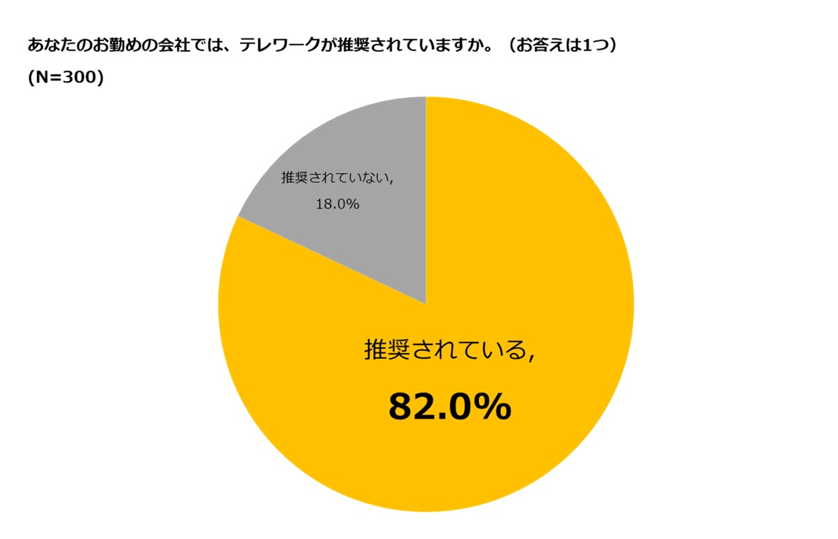 続いて、テレワークが推奨されているなか、企業が実際にどのような対応をとっているのかについての質問では、「あなたのお勤めの会社では、 テレワークが推奨されていますか」という問いに対して、82%の人が「推奨されている」と回答。