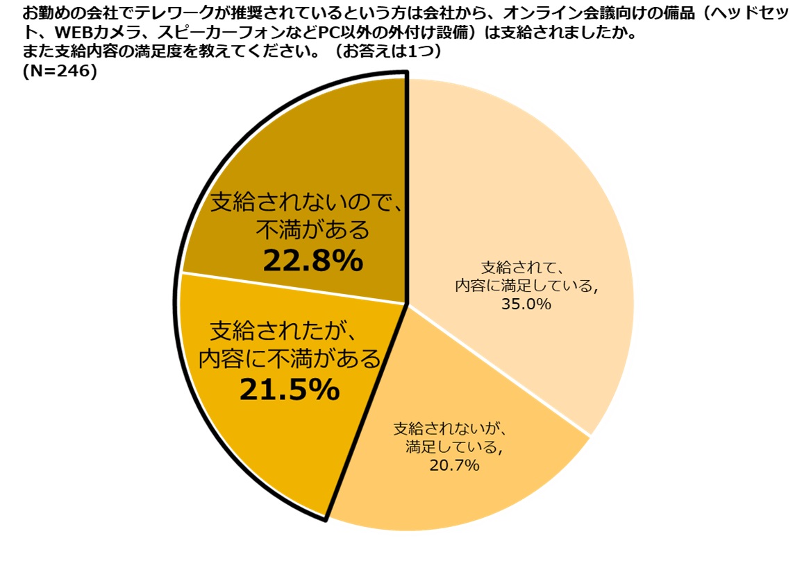 その一方で、オンライン会議用の備品(ヘッドセット、webカメラ、スピーカーなどPC以外の外付け設備)に対する会社からの援助に不満を感じている人は44.3%と半数近くに上り、テレワーク環境の整備に対し、企業からのサポートが足りないと感じている人が多いことが分かりました。