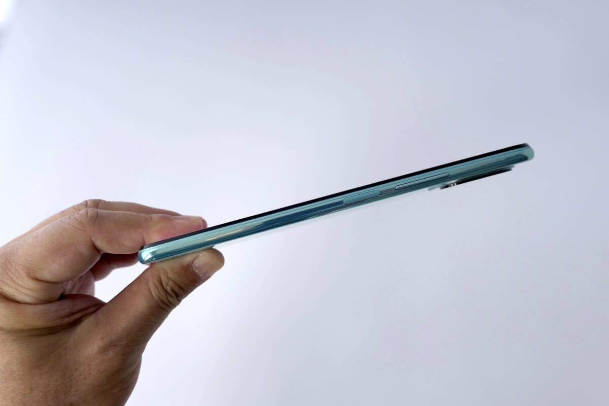 Mi 11 Lite 5Gを手にして最初に驚いたのがやはり薄さと軽さです。本体の厚さ6.81mm、重さ159gは、例えとして適切ではないかもしれませんが、板チョコのような印象を受けます。詳細は後述しますが、これだけの薄さ・軽さであっても、バッテリー容量は決して少ないわけではなく、機能を削っているわけでもありません。むしろ、最新の5Gスマホとして必要な機能をもれなく備えており、技術の高さを感じます。