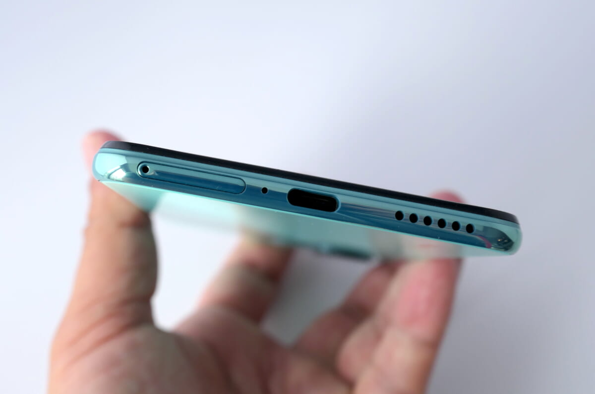 本体右側面には音量キーと、指紋センサーを兼ねる電源キーを搭載し、下部にはSIMスロットとUSB Type-Cポートを装備。SIMスロットは表裏にnanoSIMを1枚ずつ装着でき、DSDV(デュアルSIMデュアルVoLTE)にも対応しています。なお、2枚目はmicroSDとの排他利用になっています。