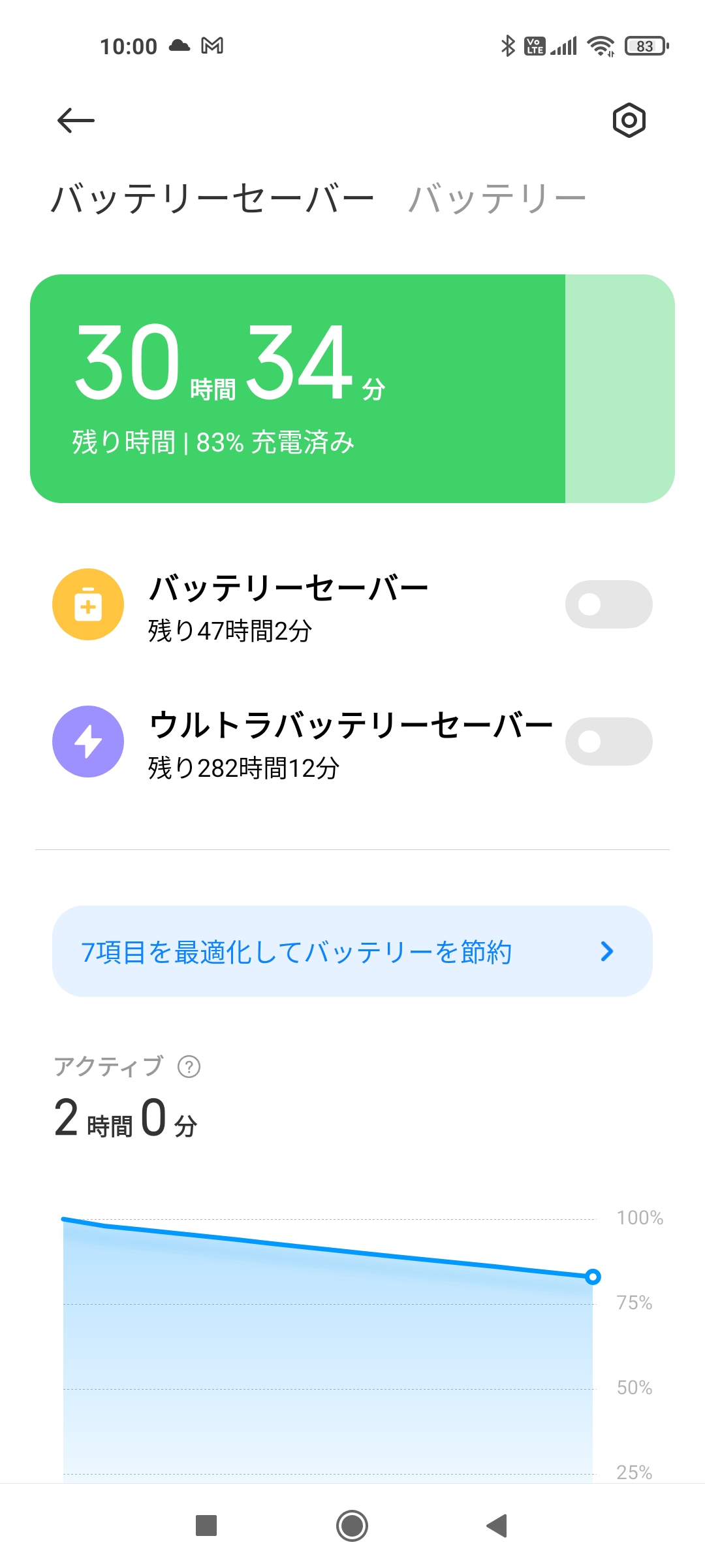 また、フル充電から「Netflix」の映画を2時間再生したところ、電池は83%残り、さらに30時間以上使える見込みが表示されました。外出先でも電池の減りを気にせずに、動画を見たり、ゲームを楽しんだりできそうです。