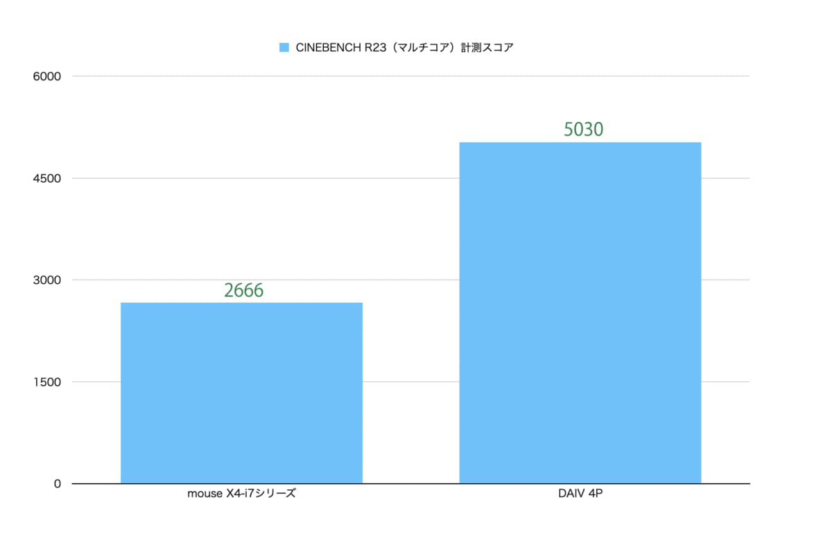 CINEBENCH R23においても、mouse X4-i7シリーズのスコアが2666(マルチコア)だったのに対し、DAIV 4Pは5030(マルチコア)と、大きな差がつき、CPUの処理性能面においてもDAIV 4Pのパフォーマンスの高さがうかがえます。