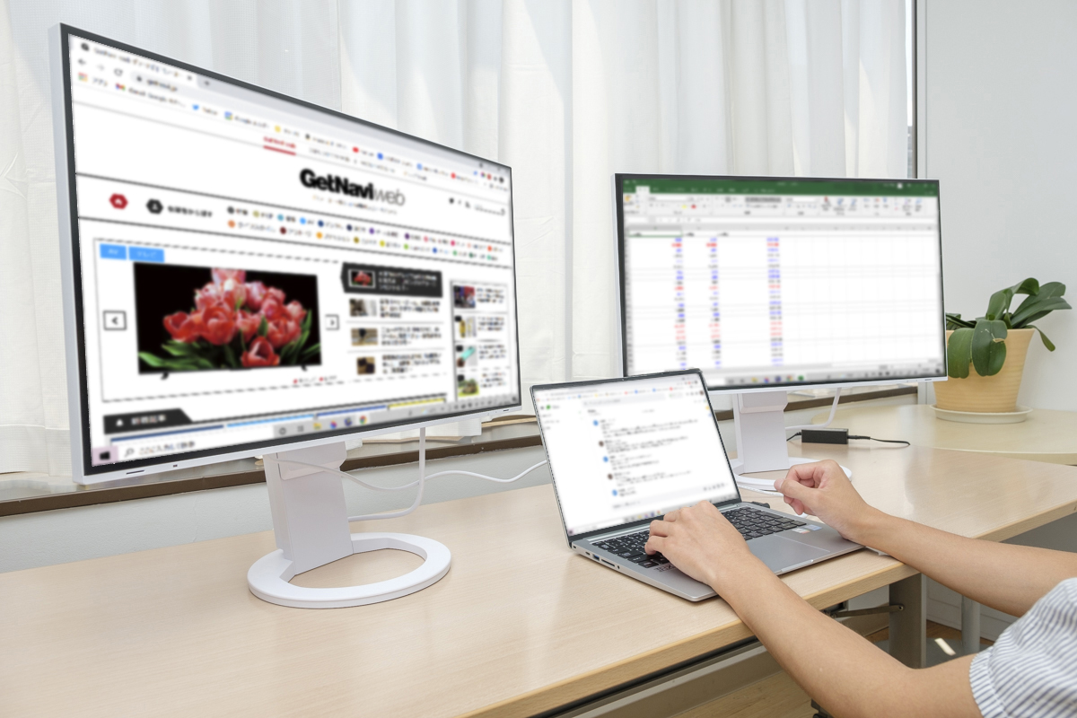 本体のディスプレイでメールを確認しながら、1台の外部ディスプレイで表計算ソフトに入力し、もう1台の外部ディスプレイでブラウジングする。こんな運用は、少し前の時代なら、ハイエンドなデスクトップPCで成せるワザでした。しかし、モバイルノートPCのDAIV 4Pでそれを実現できるのです。