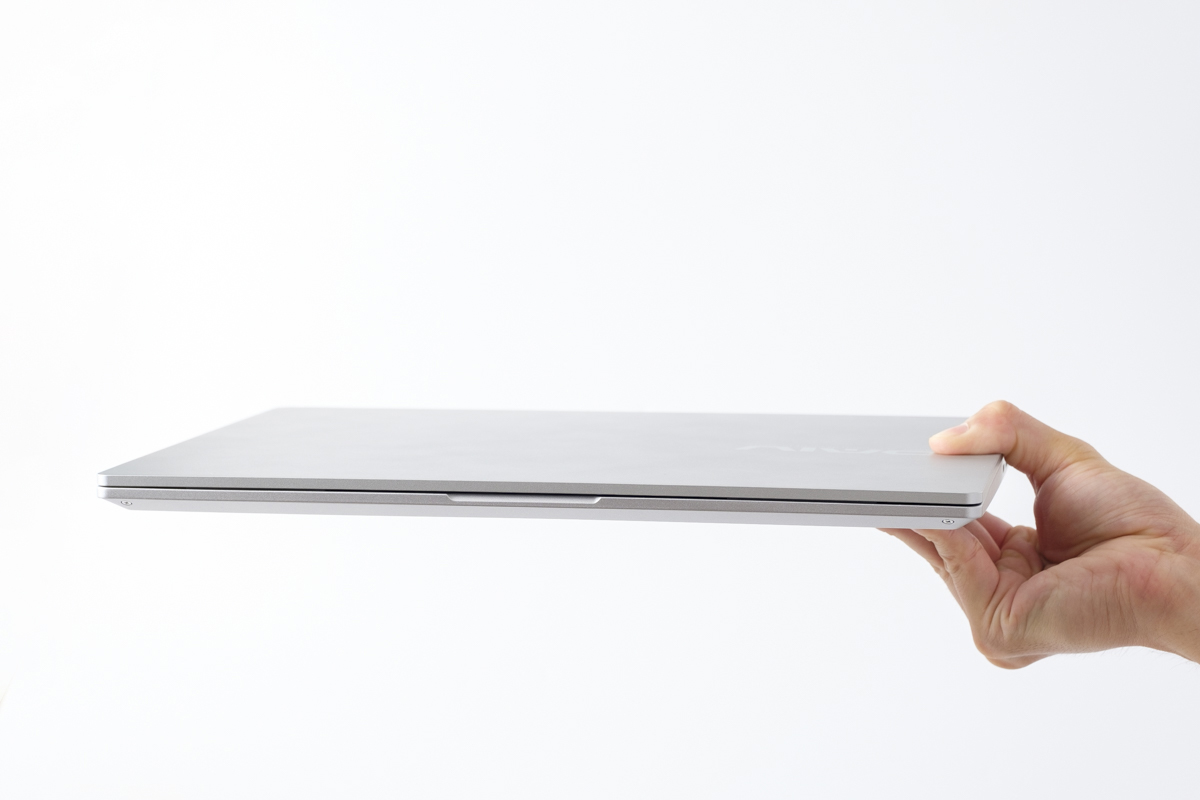 DAIV 4Pの本体サイズは約幅308.8×奥行き213×高さ16.4mm、重量は約985gと前述しましたが、これは、一般的な14型のノートPCに比べるとかなり薄く、軽量な部類に入ります。しかも重量については、DAIVブランドとしては最軽量を実現しています。