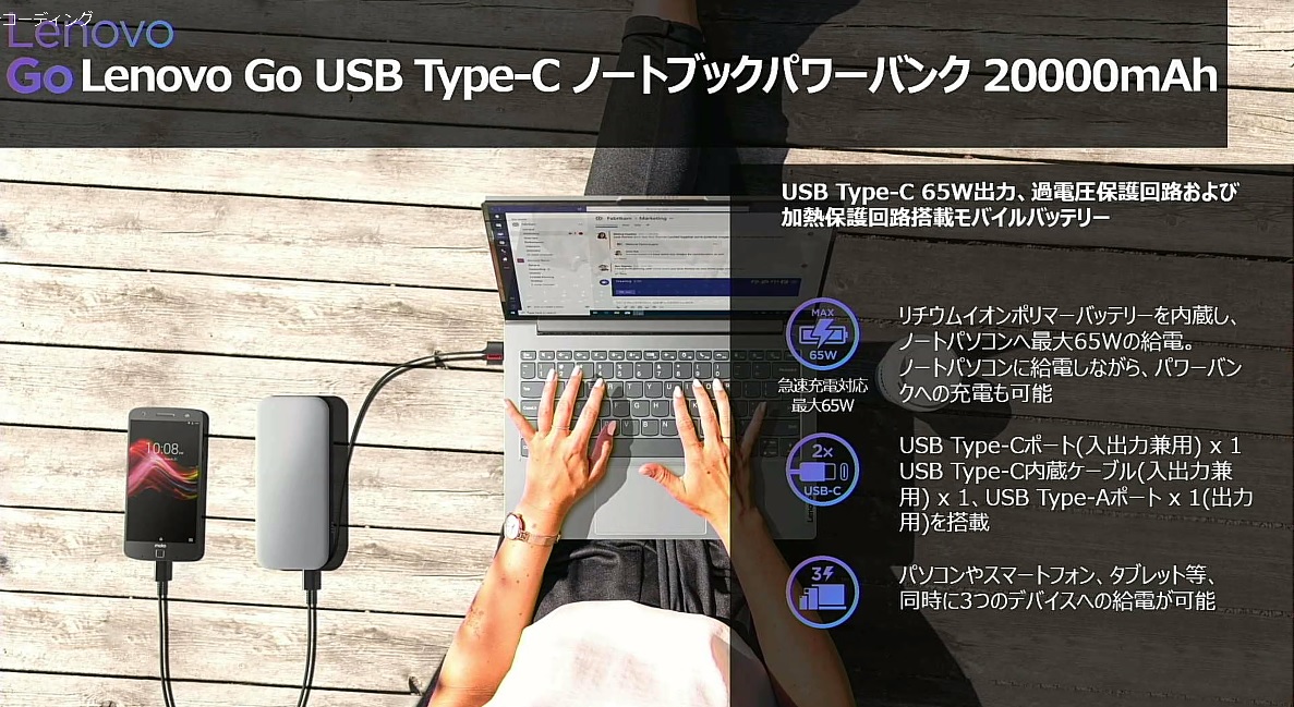 「Lenovo Go USB Type-C ノートブックパワーバンク 20000mAh」(8月3日発売/1万6500円)は、パワーパススルーに対応し、20000mAhリチウムイオンポリマーバッテリーを内蔵した大容量モバイルバッテリー。最大65Wの電力供給が可能で、外出先などでのノートPCの充電に最適です。