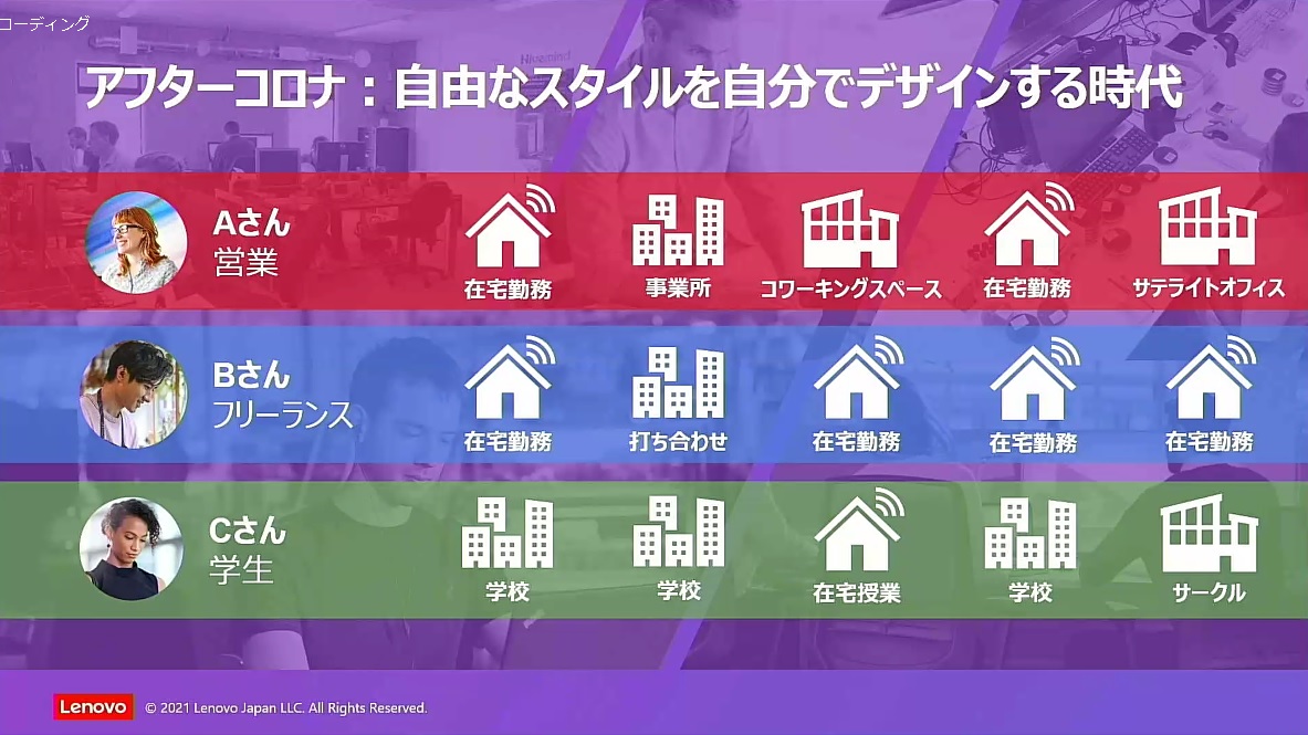 また、学生においてもオンライン授業が定着し、自宅、オフィスや学校、コワーキングスペースなど、場所に縛られない働き方・学び方が一般的になると見られています。