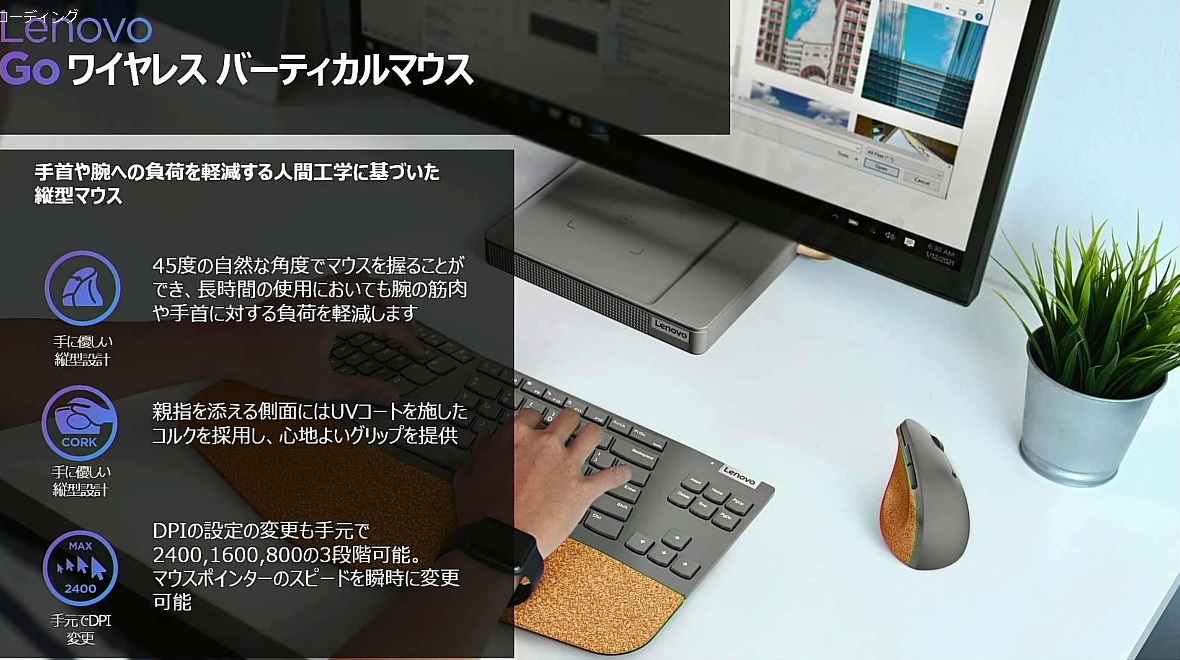 「Lenovo Go ワイヤレス バーティカルマウス」(8月3日発売/6600円)は、手首や腕の負担を軽減するグリップ姿勢を維持できる縦型デザインと、コルク素材による快適なフィット感が特徴。人間工学に基づいた設計で、生産的な作業をサポートします。側面には2つのプログラム可能なボタンを用意。専用ユーティリティソフトLenovo Go Centralにより、ボタンの割り振りやDPIの変更等が可能です。