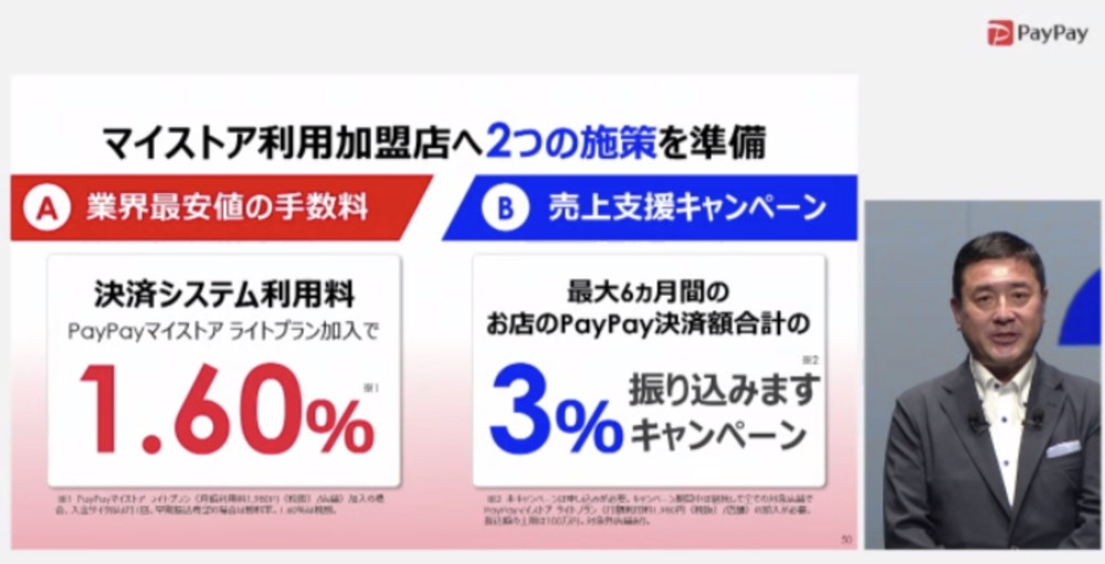 同社の取締役 副社長執行役員 COOである馬場 一氏によれば、「キャッシュカードなどの一般的な手数料は3%台であり、PayPayの手数料は約半分程度。これは国内のキャッシュレスサービスのなかでも最低水準で、国際的にみても引けをとらない」と、手数料の安さに自信を見せました。