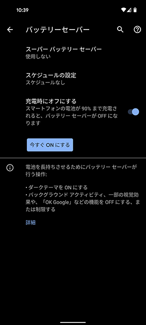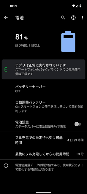 バッテリーは4680mAhと、Pixel 5よりも大容量です。なお、グーグルはバッテリーセーバーを使うことで最大48時間の連続使用を見込めるとアピールしていますが、実際に、電池持ちは良い印象。通常モードでも、長時間ゲームをしたり、動画を見続けたりしないのであれば、2日間は使い続けられそうです。