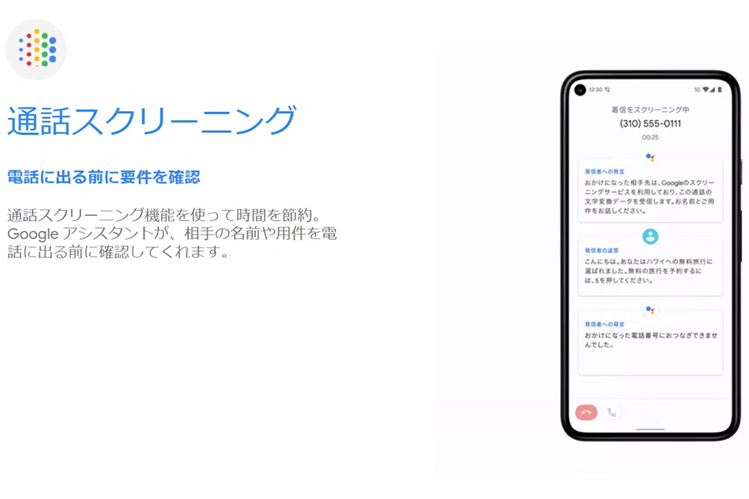 Pixelシリーズは、セキュリティに注力しているのもポイントです。Pixel 5a(5G)は、日本で今年6月から提供されている「通話スクリーニング」機能にも対応。知らない番号から着信があった場合、相手の名前や用件を確認してから、応答できます。