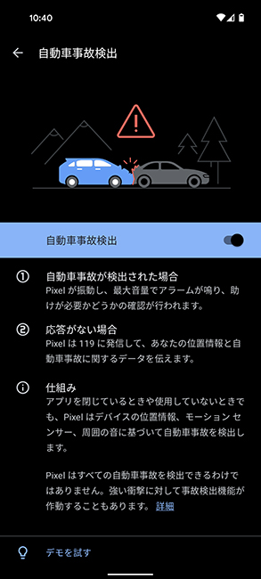 また、Pixel 5a(5G)の発売のタイミングで新たに「自動車事故検出」機能が提供されました。自動車事故を検出すると、アラームが鳴り、それに反応しないと自動で119に発信されるという機能です。