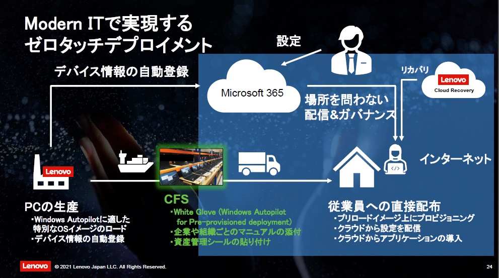 従来、従業員が使用するデバイスは企業が一括して購入やレンタル契約し、企業のIT管理担当者などが必要なOSやアプリをインストールし、管理用のタグやラベルを付与して支給されるケースが主流でしたが、働き方の自由度が高まることで個々に必要なデバイスやアプリも変わるため、販売元で最低限のOSやシステム情報などをインストールした上で、企業ごとに必要なマニュアルなどを添付して直接従業員に届けるシステムが広がるとされています。