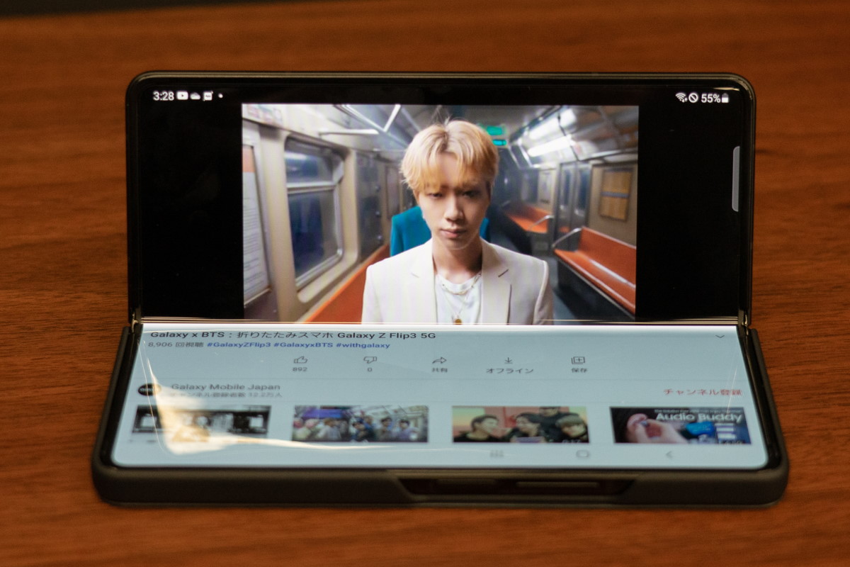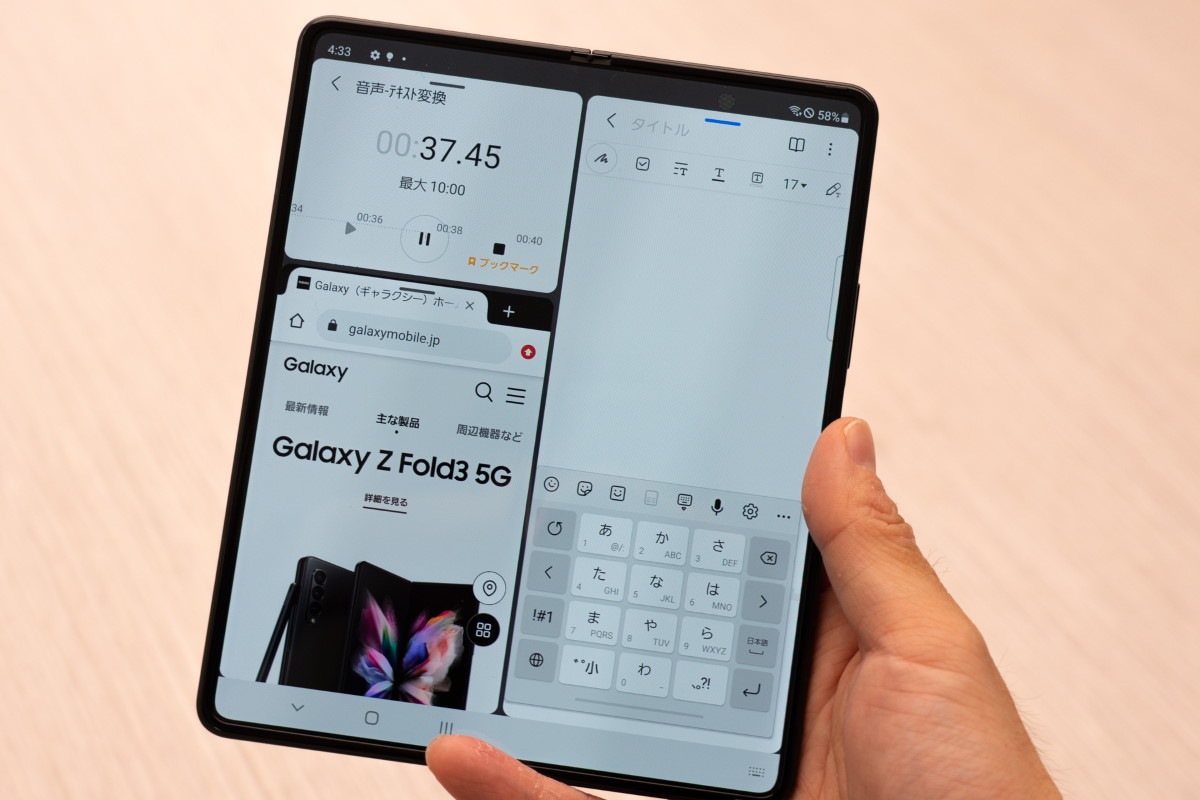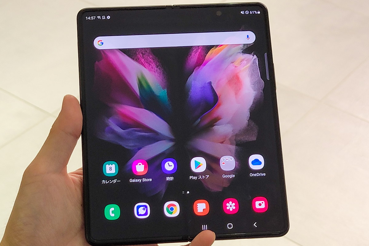 縦折り型のGalaxy Z Fold3は、折りたたんだ状態でも縦長のスマホとして使える上に、広げるとタブレットのような大画面で使えるという変幻自在な折りたたみスマホです。