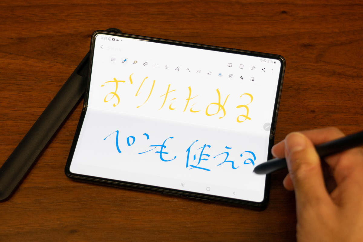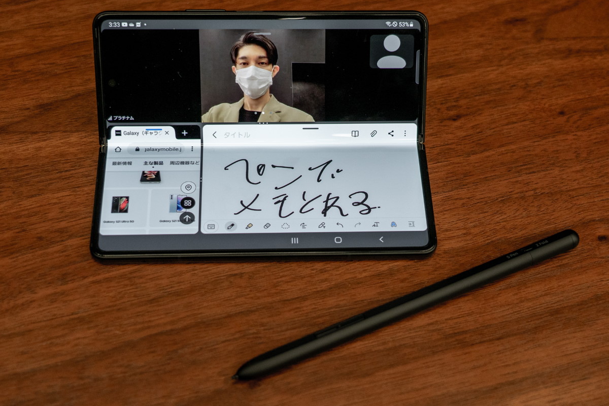 今回新たにメインディスプレイで「Sペン」に対応。これまでのGalaxy Noteシリーズのように、手書きでメモを取ったり、スケッチしたりできるようになりました。