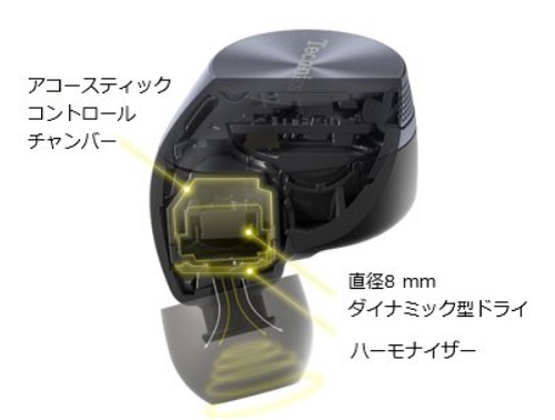 EAH-AZ60は、8mm径のバイオセルロース振動板を採用し、ハイレゾ相当の音質でワイヤレス伝送できるLDACコーデックにも対応した高音質モデル。ドライバーの前方空間の形状を最適化し高域の伸びを改善する「ハーモナイザー」と、ドライバー後方の空気の流れを調整し力強い低域を再生する「アコースティック コントロールチャンバー」が、ワイドレンジかつ自然なサウンドを実現します。