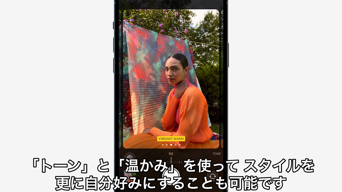 さらに、撮影モードには新たに「フォトグラフスタイル」が導入された。これは、単純なフィルターと違い、肌のトーンを一定に保ったままコントラストを高めたり、暖かみを出したりできる機能。機械学習で写っているものを認識できる、iPhoneならではの新機能だ。