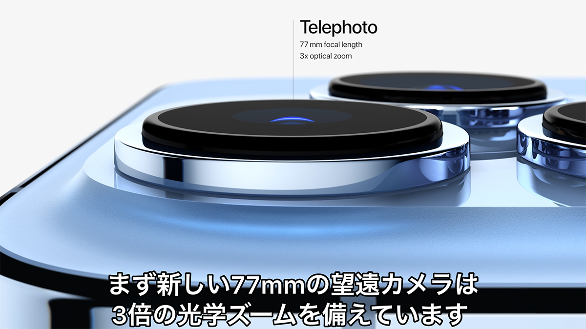 これに加えて、望遠カメラは焦点距離が変わり、35mm判換算で77mmに。これによって光学ズームは「iPhone 12 Pro」の2倍やiPhone 12 Pro Maxの2.5倍より高倍率な3倍になっている。さらに超広角カメラもF1.8になったうえに、新たにオートフォーカスが加わった。