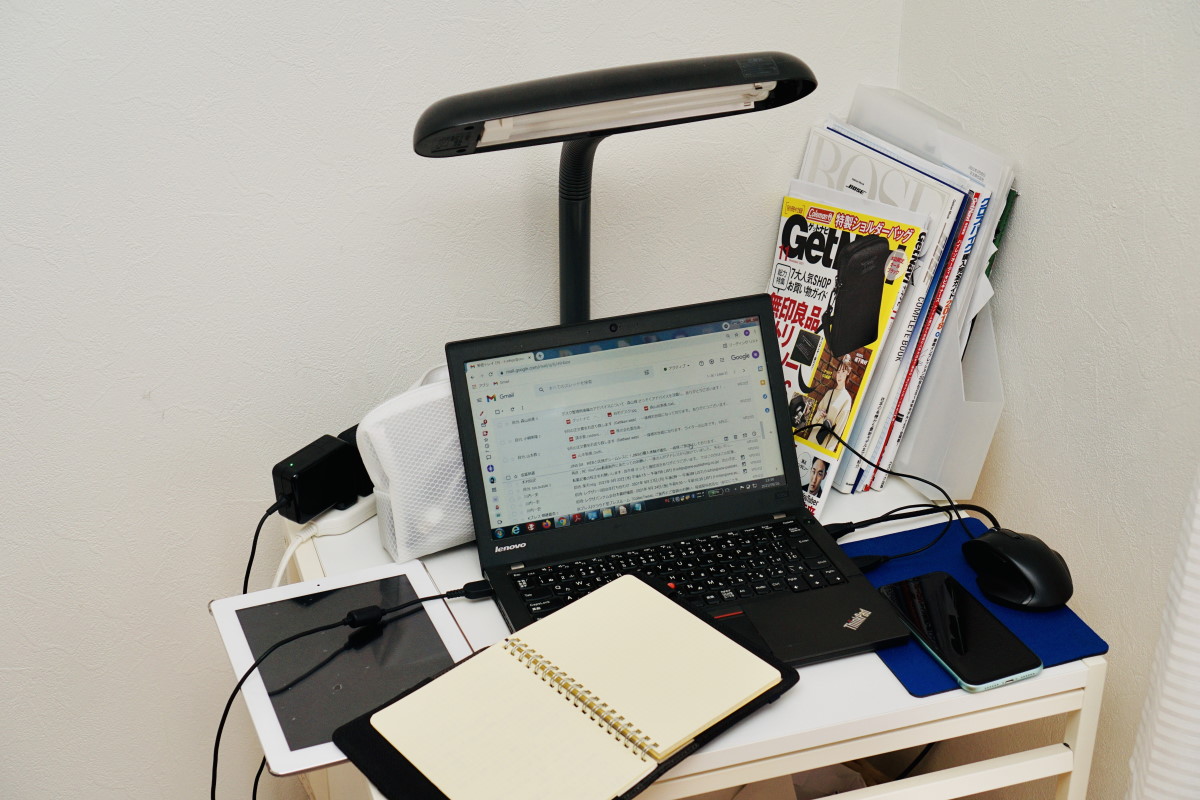 まずはゲットナビウェブ編集部・一條がリモートワークを行っている自宅のデスクをご覧頂きましょう。ノートPCで原稿を編集しながら、タブレットで調べ物をしたり、スマホでSNSのトレンドを定期的にチェックしたり、複数のデバイスを使って仕事をしているため、デスク上はモノが散乱しがち。使用しているデスクは、以前に1人用の食事テーブルとして使っていたものを仕事用に転用しているため、机の上が狭くあまりモノが置けません。