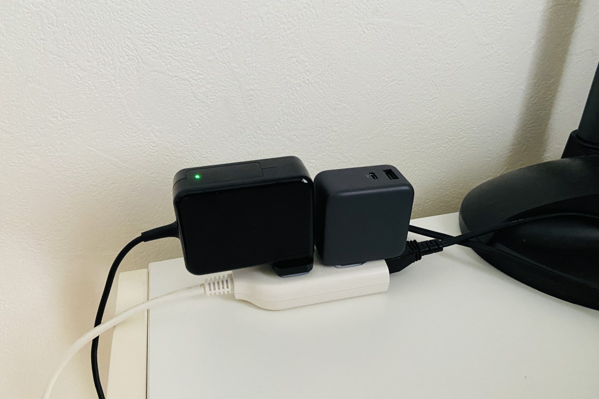 ・コード類がごちゃごちゃしており、コンセントタップが場所を取って、デスクを狭くしています。結束バンドや両面テープ付き面ファスナーなどを使って、デスクの脚か裏にタップを固定しましょう。