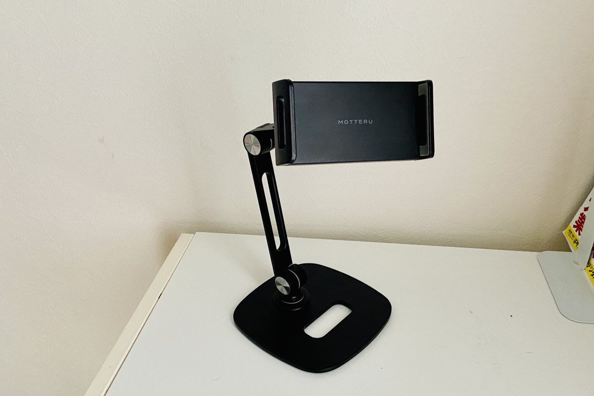 もうひとつ用意したのが、サブモニター代わりに使っているタブレット用の卓上アルミスタンド(MOT-SPSTD07)です。4~13インチまでのスマートフォン・タブレットを固定でき、角度や向きも自由に調整可能。高さがあるので、ノートPCの画面から視線の移動が少なくて済みますし、オンライン会議をするときもカメラが正面のアングルになるので使いやすいです。
