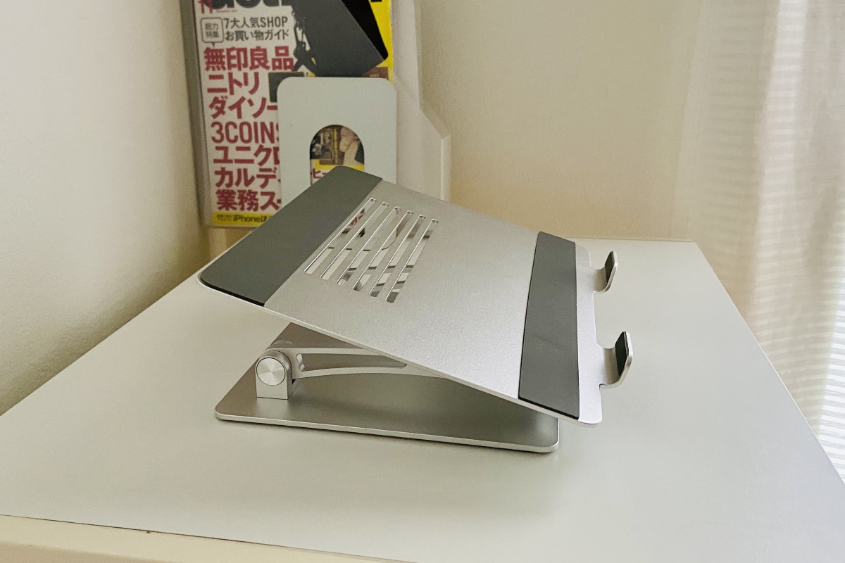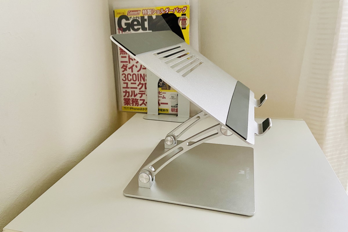 まず用意したのは、MOTTERUのアルミ製ノートPCスタンド(MOT-PCSTD01)。このスタンドを使って画面の高さを上げることで、前かがみになりがちな姿勢を正しくキープし、首や肩への負担を軽減することができます。
