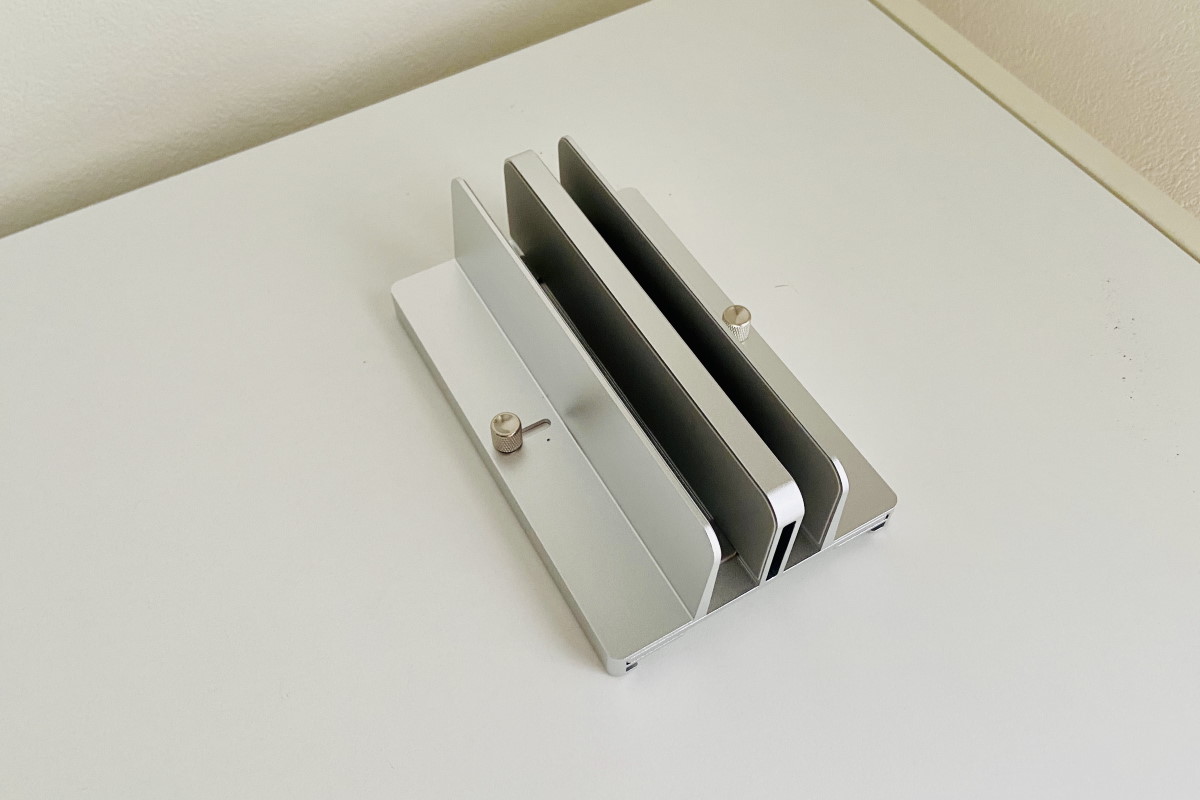 狭いデスクの上を効率的に使うため、ノートPCやタブレットを使わないときは、アルミニウムPCホルダー(MOT-PCSTD04)を活用してデバイスをまとめておくことに。このホルダーは金属製のしっかりした作りなので、デバイスの重さで倒れたりせずにキチンと立てておくことができます。ホルダー部分の幅をネジで調整できるので、厚みのあるノートPCや薄型のタブレットにも対応可能。