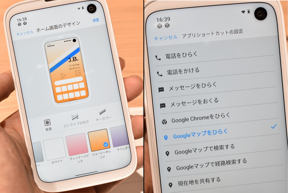 さらに、これらの機能はアイコンをタップするのではなく、ホーム画面から直感的な操作で呼び出せるのも特徴。ホーム画面を複数回タップしたり、壁紙のストライプ線をなぞったりして各アプリを起動できます。このように、デザインと操作性が結びついたショートカットも、バルミューダらしい工夫だと感じました。