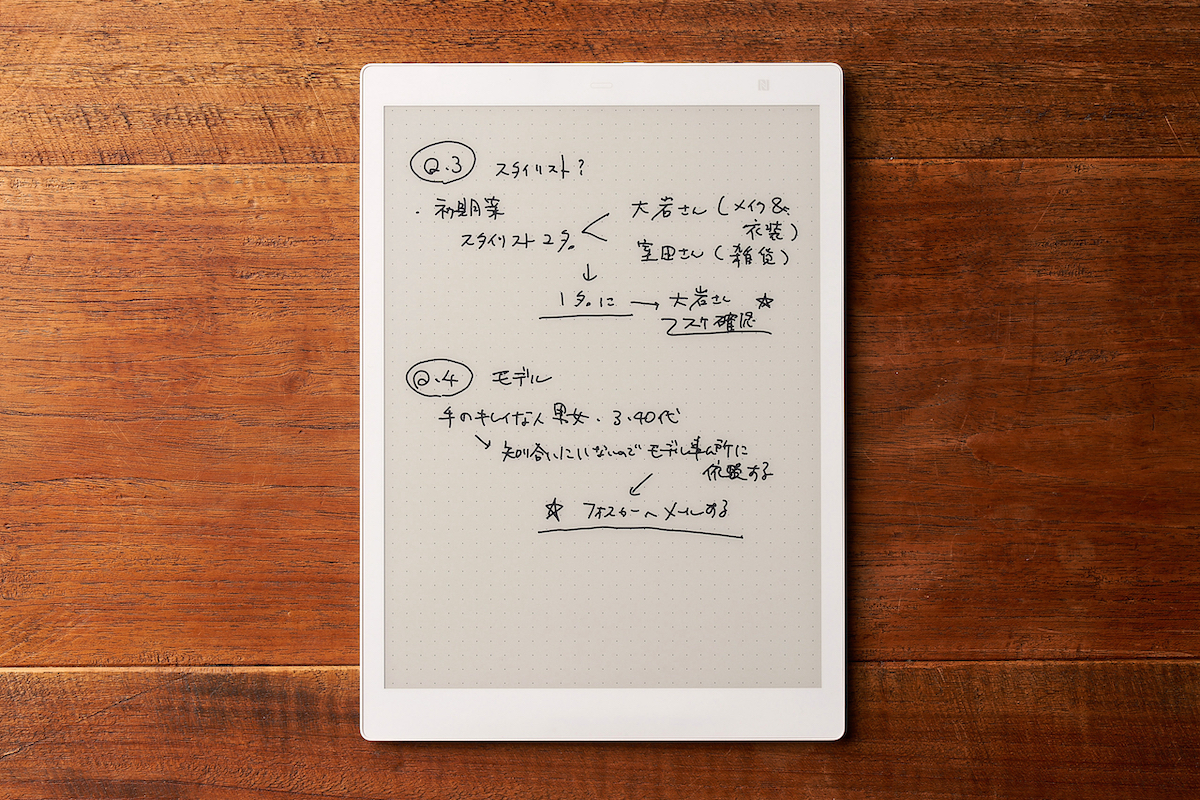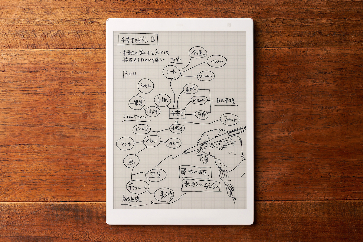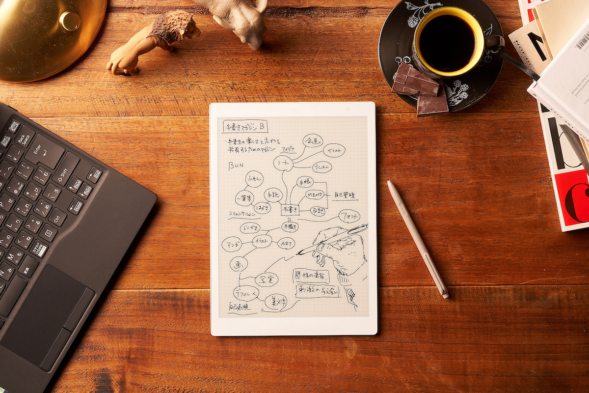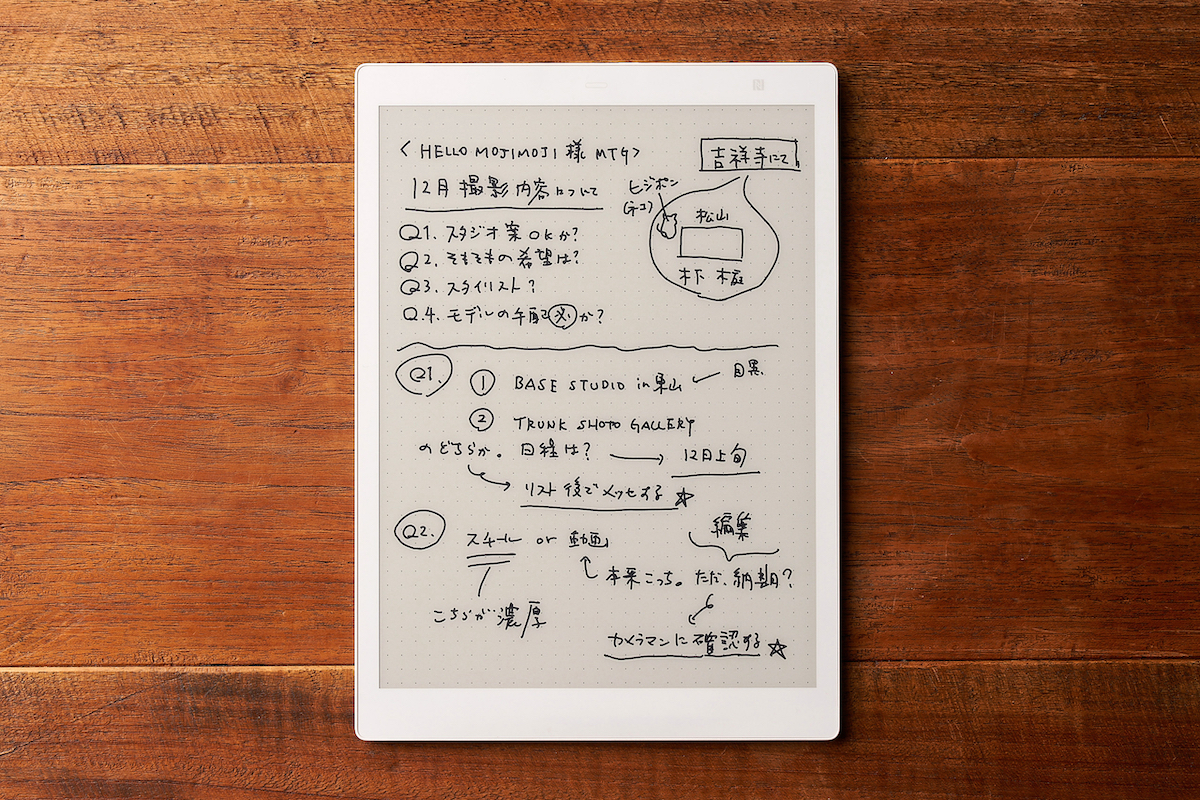 ↑木庭さんがアイデア出しをする際には、「クアデルノ」を使ってマインドマッピングを行うなどしながら、とことん自身と“ブレスト”するという ↑木庭さんが、仕事の打ち合わせでとったメモ。ページ数を気にすることなく、雑記帳のように何でも書きこんでおくという ↑木庭さんは、雑誌や書籍の設計図ともいえるデザインスケッチを作成する作業過程でも、「クアデルノ」を活用している。ページの入れ替えも、範囲を指定し移動するだけと簡単。ちなみにこのテンプレートは自作。好みのテンプレを追加できるのも、「クアデルノ」独自のメリットだ ↑「クアデルノ(Gen.2)」では、最新のE Inkパネル「E Ink Carta 1250」が搭載され、「ワコムデジタイザ」を利用したスタイラスペンのプロトコルも電磁誘導方式(EMR)を使う「Wacom EMR」へと変わった。ユーザーにとってうれしいのは、ペンの充電を行う手間がなくなり、4096段階の筆圧感知に対応したことだ ↑UI上で選択できるペンツールの種類も増えており、より手書き感を味わえるようになった ↑「クアデルノ」で書いた内容は、PDFとしてPCに出力できる。デバイスとの接続については、有線のほか、Wi-FiまたはBluetoothによる無線接続にも対応。NFC対応のスマホなら、スマホとのWi-Fi接続も容易だ ↑PCに加え、スキャナともスムーズに連携。紙の書類はスキャナを通じて取り込める。とくに「ScanSnap」シリーズと好相性だ。※ScanSnapダイレクト連携の対応機種に関する最新情報は、公式ウェブサイトをご確認ください ↑クアデルノ(Gen.2)はUSB Type-Cポートを備えるので、最新のノートPCやスマートフォンなどとケーブル類を共通化できることも魅力だ ↑タブレットPCのように画面割れを気にしなくてよく、気を遣いすぎることなくバッグなどに入れておけるのもメリット、と木庭さんは付け加える