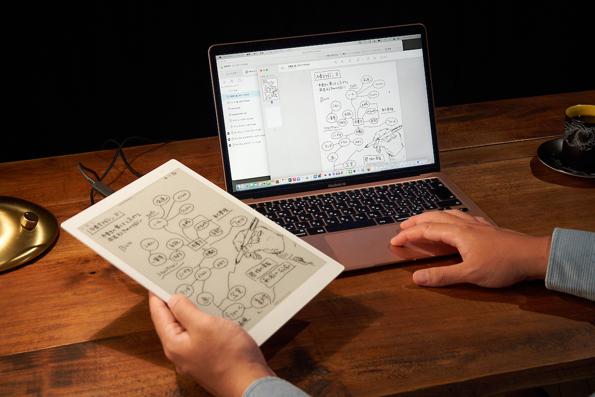 ウェブブラウジングに非対応の「クアデルノ」は、データの共有をPCやスマホを介して行う。木庭さんは、デザイナーやチームのスタッフとノートを共有する際、PC経由で送信するという。