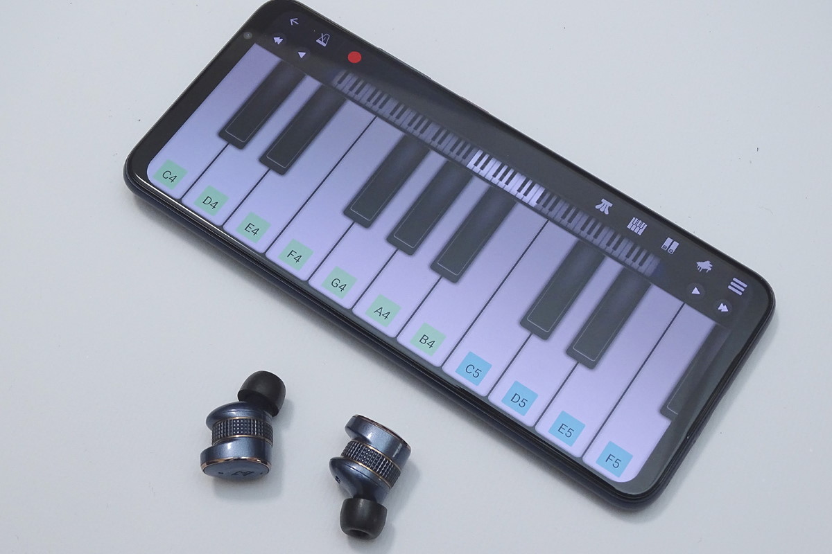 ASUSのSnapdragonスマホに簡易なピアノの演奏が楽しめるゲームアプリを入れて、入力操作に対する音声の遅延も確かめてみました。AVIOTのTE-BD21j-ltdをaptX Adaptiveに対応していないGoogle Pixel 6 Proに接続した場合と比べてみると、Snapdragonスマホの方がコマンド入力に対する音の反応が速く、心地よくプレイできます。