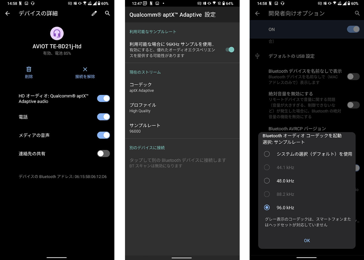 ASUSのSnapdragonスマホは、aptX Adaptiveの96kHz/24bit再生を正式にサポートするSnapdragon Sound対応機です。AVIOTのTE-BD21j-ltdにペアリングすると、コーデックは自動的にaptX Adaptiveが選択されます。通知トレイに表示される「Qualcomm aptX Adaptive設定」から、「利用可能な場合に96kHzサンプルを使用」をオンにするとAVIOTのイヤホンで96kHz/24bitのハイレゾ再生が楽しめるようになります。