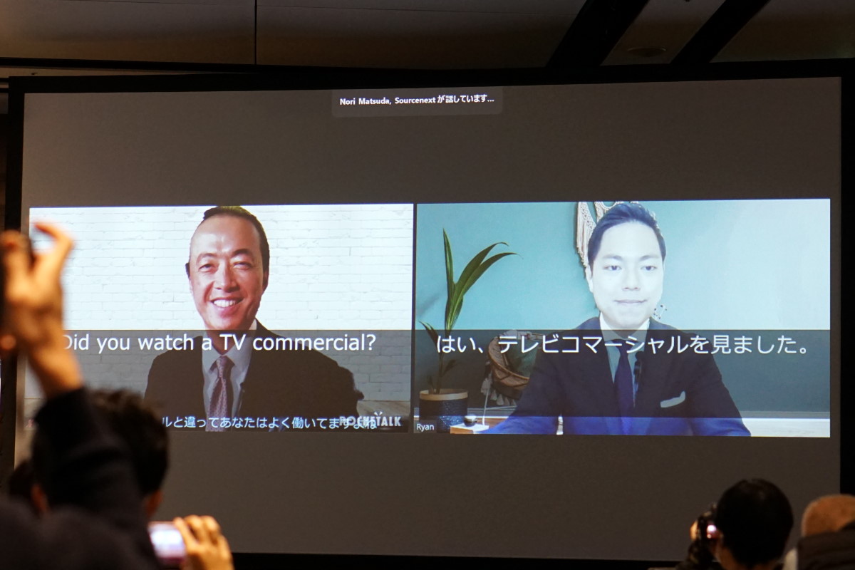 会場ではタッチ&トライのスペースが設けられ、「ポケトーク字幕」を実際に体験することができました。翻訳の精度はかなり高く、しかも高速。日本語以外の言語を話す人とのコミュニケーションも、違和感なく行えました。翻訳文章の表示位置は「画面上部」「画面下部」「全画面」と変更できるので、まさに字幕のように表示させることもできます。