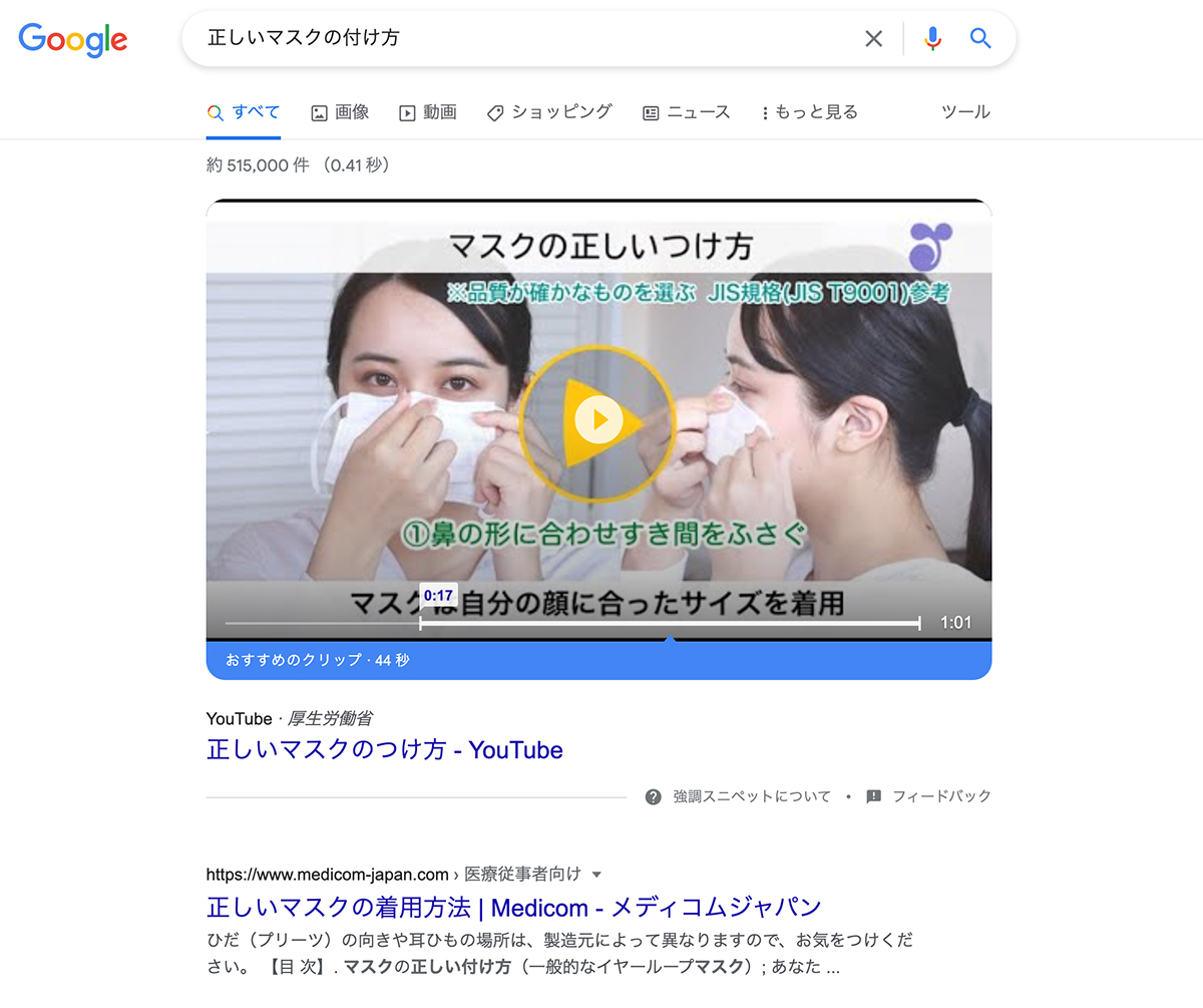 たとえば「正しいマスクのつけ方」を知りたいと思うことはありませんか? 新機能では、こういう質問に対する検索結果として、動画を表示します。さらに、提案される動画は、本当に見たい数十秒の部分、つまりマスクをつけている部分から再生されるようになっています。