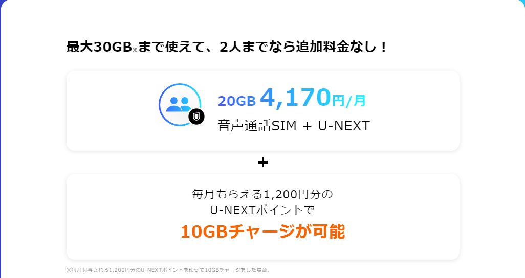 シェアU-NEXTプランは、月額4170円で20GBのプランです。最近はギガをシェアできるプランが少なくなり、スマホは“一人使い”の流れが強いですが、そこをぜひご家族で使っていただきたい。U-NEXTは最大4人で使えるファミリーアカウントを作れるので、それにあわせてSIMも4人まで利用できます。