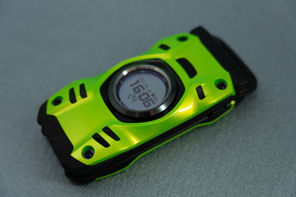 デザインは往年のG’zOne TYPE-Xを踏襲し、モータースポーツをモチーフとして取り入れています。円形になったサブディスプレイや、押しやすくなったテンキーなどは、10年の技術の進化が反映されている部分です。