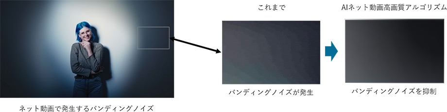 また、テレビ放送だけでなく、ネット動画の高画質化も実現。ネット動画のコントラストや精細感を向上させるほか、ネット動画で発生しやすいバンディングノイズやブロックノイズを低減し、なめらかな階調を再現します。