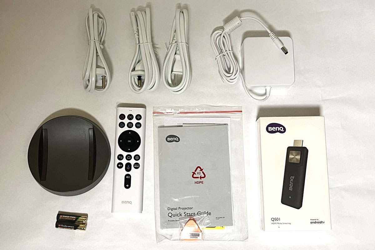 GV30は初期設定の簡単さも製品の見どころです。初めにAndroid TVハードウェアキー(QS01)を本体にセットし、台座に乗せて電源ボタンを押し、Android TVの設定をすれば完了。冒頭でも伝えましたが、フォーカスと台形補正は自動で設定してくれます。
