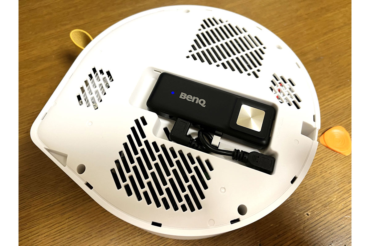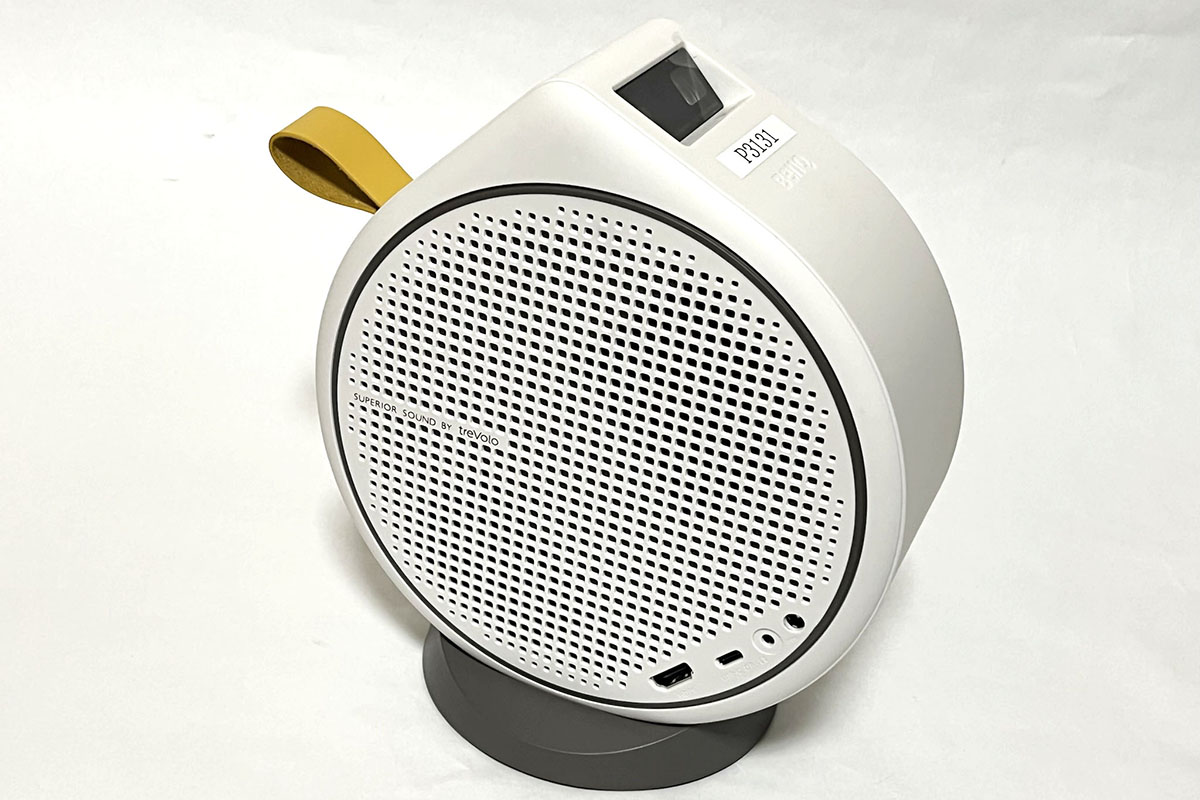 BENQから登場した「2.1チャンネルBluetoothスピーカー搭載 LED モバイルプロジェクター GV30」(以下、GV30)は、付属の台座に乗せることで、丸い本体をスライドさせながら映像投写の位置を自由に変えられる、ユニークな製品です。