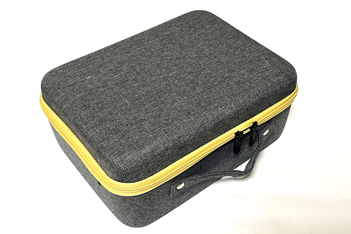 モバイルプロジェクターならではの使い方として、キャンプなどに持っていくシーンがあると思いますが、その際は専用ケースが役に立ちます。ケースはキャンバス布のような素材で、グレーとイエローのコンビカラーがオシャレ。しかもハンドル付きで持ちやすいです。